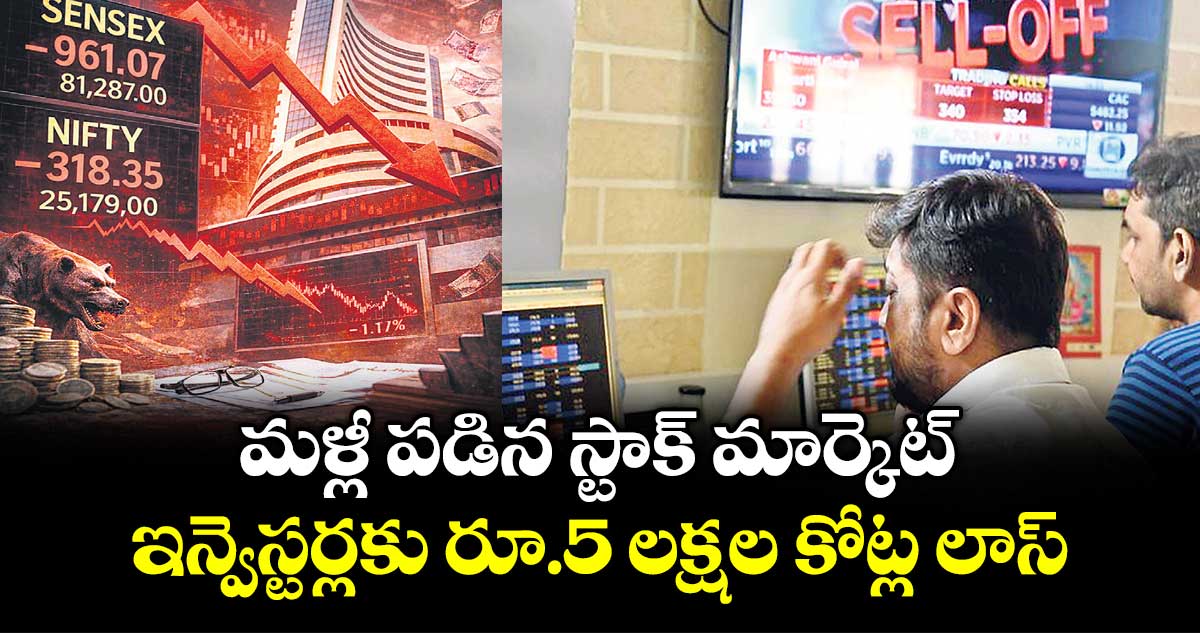 అమెరికా స్టాక్ మార్కెట్లో టెక్ షేర్ల పతనం, అమెరికా- ఇరాన్ టెన్షన్స్ నేపథ్యంలో మన స్టాక్ మార్కెట్లు మరోసారి భారీగా పడ్డాయి. ఇన్వెస్టర్లు రూ.5 లక్షల కోట్లు నష్టపోయారు. సెన్సెక్స్ శుక్రవారం 961 పాయింట్లు తగ్గి 81,287 దగ్గర, నిఫ్టీ 318 పాయింట్ల నష్టంతో 25,179 దగ్గర ముగిశాయి. డాలర్తో రూపాయి విలువ 6 పైసలు తగ్గి 90.97 వద్ద సెటిలైంది. ఫారిన్ ఇన్స్టిట్యూషనల్ ఇన్వెస్టర్లు (ఎఫ్ఐఐలు) నికరంగా రూ.3,466 కోట్ల విలువైన షేర్లను అమ్ముకున్నారు. అమెరికా మార్కెట్లు గురువారం సెషన్లో పడడంతో ఆ ఎఫెక్ట్ గ్లోబల్ మార్కెట్లపై కనిపించింది.