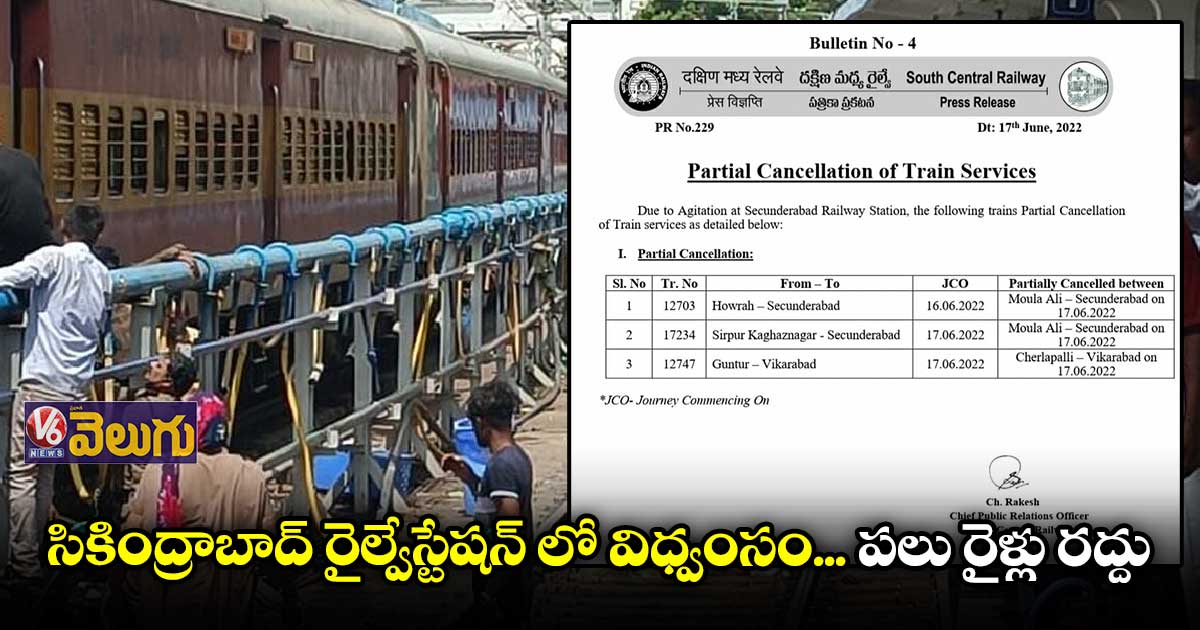 అయితే ఆందోళనకారులు సృష్టించిన ఈ అలజడి నేపథ్యంలో 6 రైళ్లను రద్దు చేసిన అధికారులు..2 రైళ్లను దారి మళ్లించారు.1 రైలును పాక్షికంగా రద్దు చేసినట్టు దక్షిణ మధ్య రైల్వే ఓ ప్రకటనలో తెలిపింది. వీటిలో ముఖ్యంగా హైదరాబాద్ టూ షాలిమార్, ఉమ్దా నగర్ టూ సికింద్రాబాద్, సికింద్రాబాద్ టూ ఉమ్దా నగర్, ఉమ్దా నగర్ టూ సికింద్రాబాద్, సికింద్రాబాద్ టూ ఉమ్దానగర్, ఉమ్దానగర్ టూ సికింద్రాబాద్ రైళ్లను రద్దు చేసి రద్దు చేసిన రైల్వే శాఖ.. సికింద్రాబాద్ టూ రేపల్లె రైలును పాక్షికంగా రద్దు చేసింది. షిరిడీ సాయి నగర్ టూ కాకినాడ పోర్టుకు వెళ్లే రైలును సనత్ నగర్, అమ్ముగూడ, చెర్లపల్లి మీదుగా దారి మళ్లించగా.. భువనేశ్వర్ టూ ముంబయి సీఎస్టీ వెళ్లాల్సిన రైలును చెర్లపల్లి, అమ్ముగూడ, సనత్ నగర్ మీదుగా వెళ్లేటట్టు ఏర్పాటు చేసినట్లు అధికారులు ప్రకటించారు.