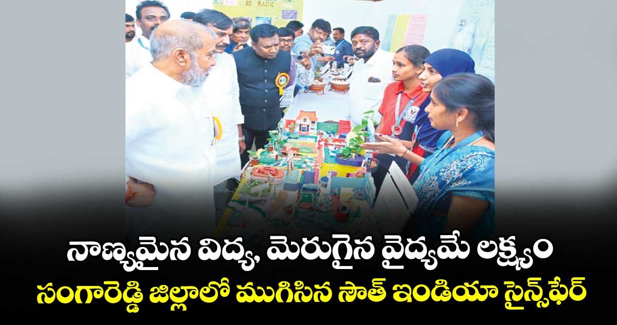 సంగారెడ్డి జిల్లా రామచంద్రాపురం మండలం కొల్లూర్ పరిధిలోని గాడియం స్కూల్లో జరిగిన సౌత్ ఇండియా సైన్స్ఫేర్ శుక్రవారం ముగిసింది. ఈ ముగింపు కార్యక్రమానికి మంత్రి హాజరై.. ప్రతిభ కనబరిచిన స్టూడెంట్లకు బహుమతులు అందజేశారు. ఈ సందర్భంగా మంత్రి మాట్లాడుతూ.. ప్రస్తుత పోటీ ప్రపంచంలో రాణించాలంటే బాషా ప్రావీణ్యంతో పాటు స్కిల్స్ సైతం అవసరమని, అందుకే ప్రతి నియోజకవర్గంలో ఇంటిగ్రేటెడ్ స్కూల్స్ నిర్మిస్తున్నట్లు చెప్పారు.