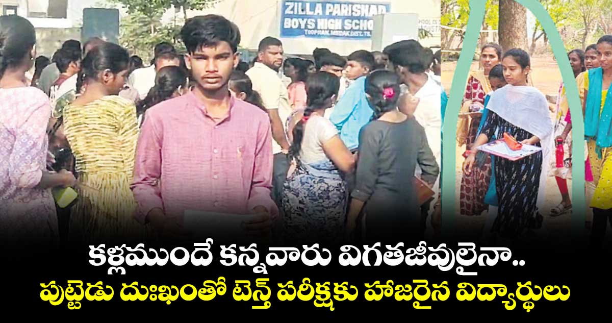 ఇంట్లో తండ్రి డెడ్బాడీ, హాస్పిటల్లో చికిత్స పొందుతున్న తల్లి.. ఇలాంటి పరిస్థితిలోనూ దుఃఖాన్ని కడుపులోనే దాచుకొని టెన్త్ ఎగ్జామ్కు హాజరయ్యాడు ఓ స్టూడెంట్. మెదక్ జిల్లా శివ్వంపేట మండలం పాంబండ గ్రామానికి చెందిన కుమ్మరి నాగరాజు (45) మేస్త్రీగా పనిచేస్తున్నాడు. శుక్రవారం ఉదయం పనికి వెళ్తూ తన భార్య అంజమ్మను సంగారెడ్డి జిల్లా గుమ్మడిదల మండలం కొత్తపల్లిలోని బంధువుల ఇంటి వద్ద దింపాడు. సాయంత్రం పని ముగిసిన తర్వాత భార్యను బైక్ మీద ఎక్కించుకొని తిరిగి ఇంటికి వస్తున్నాడు. ఈ క్రమంలో ఉసిరికపల్లి గ్రామ శివారులోకి రాగానే బైక్ అదుపు తప్పడంతో ఇద్దరూ కిందపడిపోయారు. తీవ్రంగా గాయపడిన వారిని స్థానికులు తూప్రాన్ ప్రభుత్వ ఆసుపత్రికి తరలించగా నాగరాజు అప్పటికే చనిపోగా, అంజమ్మకు ట్రీట్మెంట్ కొనసాగుతున్నది. కాగా.. నాగరాజు, అంజమ్మ దంపతుల చిన్న కొడుకు ధనుష్ తూప్రాన్లోని ఓ ప్రైవేట్స్కూల్లో టెన్త్ చదువుతూ.. శనివారం మొదటి ఎగ్జామ్కు హాజరుకావాల్సి ఉంది. ఓ వైపు తండ్రి అంత్యక్రియలకు ఏర్పాట్లు జరుగుతుండగా.. మరో వైపు తల్లి తీవ్రగాయాలతో హాస్పిటల్లో ఉన్నప్పటికీ... పుట్టెడు దుఃఖంతోనే ధనుష్ తూప్రాన్ పట్టణంలోని గవర్నమెంట్ బాయ్స్ హైస్కూల్లో ఎగ్జామ్కు హాజరయ్యాడు. పరీక్ష రాసేందుకు బయలుదేరుతున్న సమయంలో తండ్రి డెడ్బాడీపైన పడి బోరున విలపించడం అక్కడున్నవారిని కలచివేసింది. పరీక్ష పూర్తయ్యాక గ్రామానికి వచ్చి తండ్రి అంత్యక్రియల్లో పాల్గొన్నాడు.