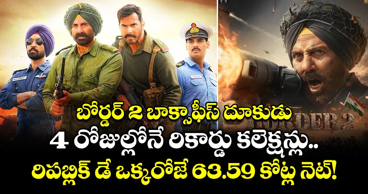 బాలీవుడ్ స్టార్ హీరోస్ సన్నీ దీియోల్, వరుణ్ ధావన్ నటించిన బోర్డర్ 2 దుమ్మురేపే వసూళ్లు సాధిస్తోంది. నాలుగు రోజుల్లోనే బోర్డర్ 2 మూవీ ప్రపంచవ్యాప్తంగా రూ.250 కోట్లకు పైగా గ్రాస్, ఇండియా బాక్సాఫీస్ వద్ద రూ.193.48 కోట్ల నెట్ కలెక్షన్స్ సాధించింది. జనవరి 26 రిపబ్లిక్ డే హాలీడే సందర్భంగా, సోమవారం నాడు ఒక్కరోజే రూ.63.59 కోట్ల నెట్ సాధించి దూకుడు కనబరిచింది. ఈ విషయన్ని మేకర్స్ ప్రకటిస్తూ, బోర్డర్ 2 సినిమా కలెక్షన్ల వివరాలు వెల్లడించారు.