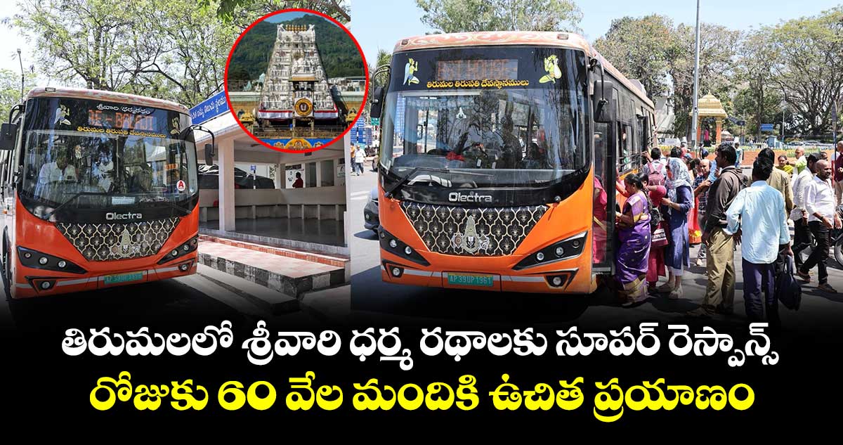 తిరుమలలో శ్రీవారి భక్తుల సౌకర్యం కోసం నిర్వహిస్తున్న శ్రీవారి ధర్మ రథాలకు మంచి స్పందన వస్తోందని తెలిపింది టీటీడీ.డిజిటల్ డిస్ప్లే బోర్డులు ఏర్పాటుతో మరింత ప్రజాదరణ లభిస్తోందని తెలిపింది టీటీడీ. శ్రీవారి ధర్మ రథాల ద్వారా రోజుకు 60 వేల మంది భక్తులు ఉచితంగా ప్రయాణిస్తున్నట్లు తెలిపింది టీటీడీ. బస్సులు వచ్చే సమయాన్ని భక్తులు ముందుగానే తెలుసుకునేలా డిజిటల్ డిస్ప్లే బోర్డులు ఏర్పాటు చేయడం వల్ల వేచిచూసే సమయం తగ్గి, ఉచిత బస్సు సేవలను విస్తృతంగా వినియోగిస్తున్నారని పేర్కొంది టీటీడీ.