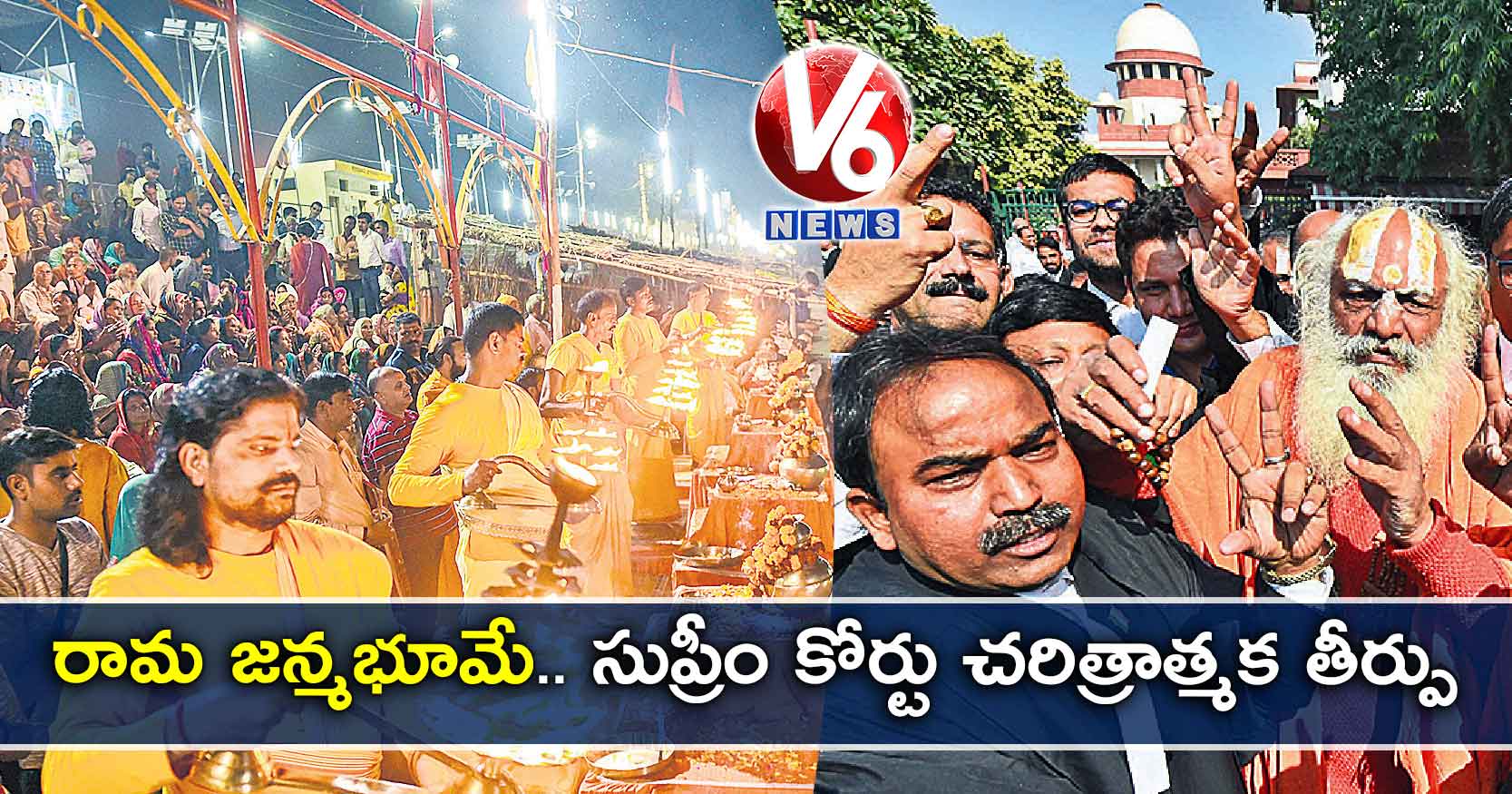 అయోధ్య భూవివాదంలో సుప్రీంకోర్టు తుది తీర్పు వెలువరించింది. సుమారు 134 ఏండ్ల నుంచి సాగుతున్న ఈ వివాదానికి చీఫ్ జస్టిస్ రంజన్ గొగోయ్ ఆధ్వర్యంలోని ఐదుగురు జడ్జిల రాజ్యాంగ ధర్మాసనం శనివారం తెరదించింది. 2.77 ఎకరాల భూమి రామ్లల్లా (రాముడి)కే చెందుతుందని తీర్పు చెప్పింది. మసీదు నిర్మాణం కోసం ప్రత్యామ్నాయంగా 5 ఎకరాల స్థలాన్ని సున్నీ వక్ఫ్ బోర్డుకు కేటాయించాలని ఆర్డర్ ఇచ్చింది. అయోధ్యలోనే కేంద్రం సేకరించిన స్థలంలో గానీ, ఇంకెక్కడైనా కానీ సున్నీ వక్ఫ్ బోర్డుకు ఇవ్వాలని సూచించింది. సుప్రీం తీర్పు నేపథ్యంలో దేశవ్యాప్తంగా హై అలర్ట్ ప్రకటించారు. సోషల్ మీడియాలో పోస్టింగ్లపై కఠిన నిబంధనలు విధించారు. ఉదయం 10.30 గంటలకు జస్టిస్ గొగోయ్ తీర్పును చదవడం ప్రారంభించి 11 గంటలకు ముగించారు. దశాబ్దాలుగా దేశరాజకీయాలను కుదిపేస్తున్నఈ భూవివాదానికి సుప్రీం పరిష్కారం చూపడంతో అన్నివర్గాలు హర్షం వ్యక్తం చేశాయి. ప్రధాని నరేంద్రమోడీ, కాంగ్రెస్ మాజీ చీఫ్ రాహుల్గాంధీ సహా పలు రాష్ట్రాల ముఖ్యమంత్రులు, రాజకీయ ప్రముఖులు స్వాగతించారు. ముస్లిం పర్సనల్ లా బోర్డు లాంటి కొన్ని సంస్థలు మాత్రం తీర్పును గౌరవిస్తామని, అయితే తాము ఆశించినట్లుగా అది లేదని తెలిపాయి. రివ్యూ పిటిషన్ వేయాలో వద్దో ఆలోచించి నిర్ణయిస్తామని ప్రకటించాయి.