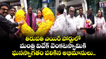 తిరుపతి ఎయిర్ పోర్టులో మంత్రి వివేక్ వెంకటస్వామికి ఘనస్వాగతం పలికిన అభిమానులు..