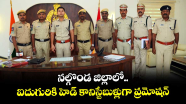 నల్గొండ జిల్లాలో ఐదుగురు కానిస్టేబుళ్లకు ప్రమోషన్ వచ్చింది. ఆర్ముడ్ రిజర్వ్ విభాగంలో పనిచేస్తున్న ఐదుగురు హెడ్ కానిస్టేబుళ్లుగా పదోన్నతి పొందారు