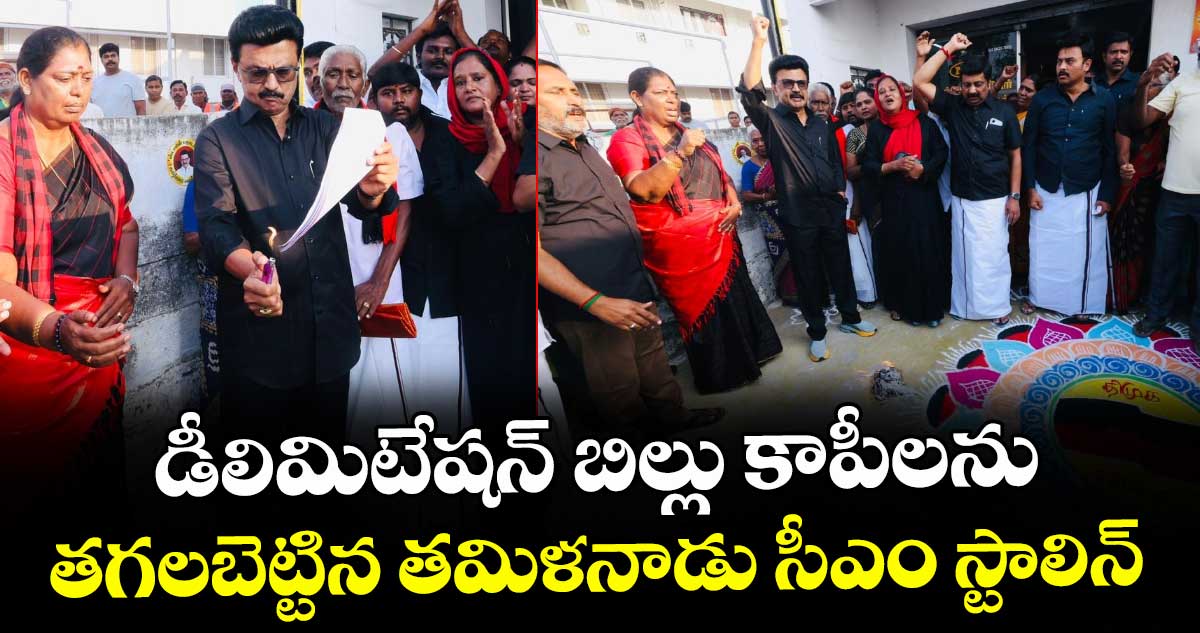 చెన్నై: తమిళనాడు ముఖ్యమంత్రి స్టాలిన్ డీలిమిటేషన్ బిల్లు కాపీలను తగలబెట్టి నిరసన తెలిపారు. నియోజకవర్గాల పునర్విభజన బిల్లు ప్రతిని దహనం చేసిన సీఎం స్టాలిన్.. ఈ బిల్లును 'నల్ల చట్టం'గా అభివర్ణించారు. తమిళనాడు ముఖ్యమంత్రి స్టాలిన్ గురువారం నియోజకవర్గాల పునర్విభజన బిల్లు ప్రతిని దహనం చేశారు. ఈ బిల్లు తమిళ ప్రజలను వారి సొంత భూమిలోనే 'శరణార్థులుగా' మార్చాలని చూస్తోందని ఆయన ఆరోపించారు. పార్లమెంటు ప్రత్యేక సమావేశానికి కొన్ని గంటల ముందు.. స్టాలిన్ డీఎంకే పార్టీ ఆఫీస్పై నల్ల జెండాను ఎగురవేసి నిరసన తెలిపారు.
