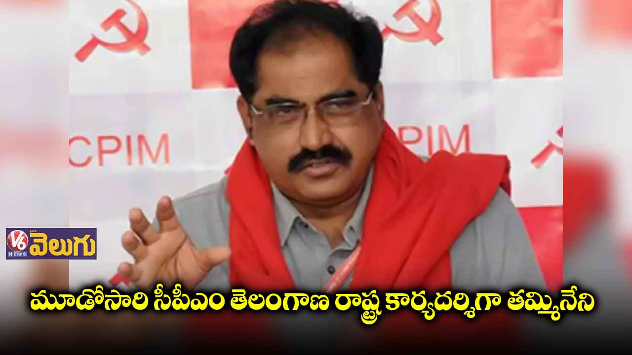 సీపీఎం తెలంగాణ రాష్ట్ర కార్యదర్శిగా తమ్మినేని వీరభద్రం మరోసారి ఎన్నికయ్యారు. ఈ పదవిని చేపట్టడం ఆయనకు ఇది మూడోసారి. 60 మంది కార్యవర్గ సభ్యుల ఎన్నిక కూడా పూర్తి చేశారు. రంగారెడ్డి జిల్లా తుర్కాయంజాల్ లో ఆదివారం నుంచి సీపీఎం తెలంగాణ రాష్ట్ర పార్టీ 3వ మహాసభలు జరుగుతున్నాయి. రాష్ట్ర కార్యదర్శి రేసులో మాజీ ఎమ్మెల్యే జూలకంటి రంగారెడ్డి, సీఐటీయూ నేత ఎస్.వీరయ్య, వ్యవసాయ కార్మిక సంఘం నేత వెంకట్ ల పేర్లు కూడా వినిపించాయి. అయితే..తమ్మినేనికే మరోసారి పార్టీ పగ్గాలు లభించాయి.
