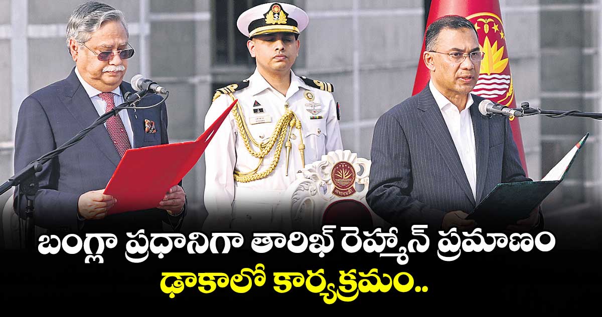 ఢాకా: బంగ్లాదేశ్ ప్రధానిగా బంగ్లాదేశ్ నేషనలిస్ట్ పార్టీ (బీఎన్పీ) చీఫ్ తారిఖ్ రెహ్మాన్(60) ప్రమాణం చేశారు. మంగళవారం ఢాకాలోని జాతీయ పార్లమెంటు (జాతీయ సంసద్) సౌత్ ప్లాజాలోని బహిరంగ ప్రదేశంలో ప్రమాణ స్వీకార కార్యక్రమం నిర్వహించారు. తారిఖ్ రెహ్మాన్తో ప్రెసిడెంట్ మహమ్మద్ షాబుద్దీన్ ప్రమాణ స్వీకారం చేయించారు.