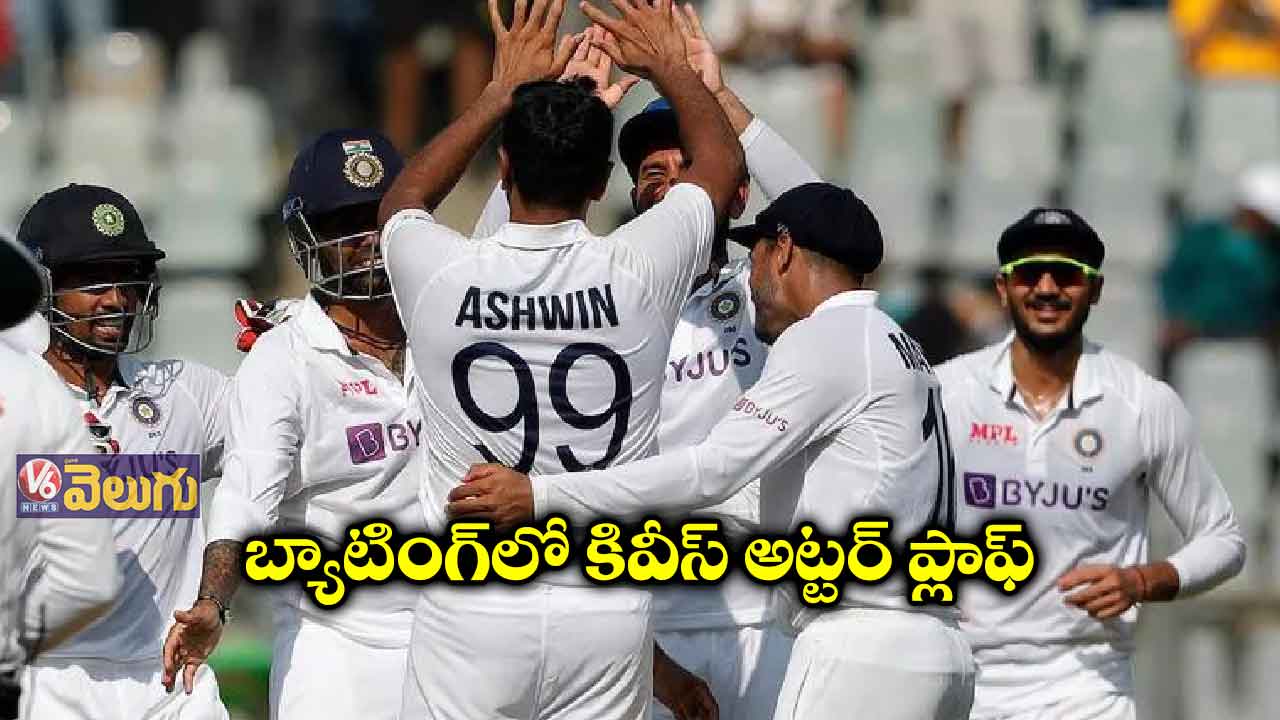 న్యూజిలాండ్ ఫస్ట్ ఇన్నింగ్స్: లాథమ్ (సి) శ్రేయస్ (బి) సిరాజ్ 10, విల్ యంగ్ (సి) కోహ్లీ (బి) సిరాజ్ 4, మిచెల్ (ఎల్బీ) పటేల్ 8, టేలర్ (బి) సిరాజ్ 1, నికోల్స్ (బి) అశ్విన్ 7, బ్లండెల్ (సి) పుజారా (బి) అశ్విన్ 8, రవీంద్ర (సి) కోహ్లీ (బి) జయంత్ 4, జెమీసన్ (సి) శ్రేయస్ (బి) పటేల్ 17, సౌథీ (సి) (సబ్) సూర్యకుమార్ (బి) అశ్విన్ 0, సోమర్విల్లే (సి) సిరాజ్ (బి) అశ్విని 0, అజాజ్ పటేల్ (నాటౌట్) 0, ఎక్స్ట్రాలు: 3, మొత్తం: 28.1 ఓవర్లలో 62 ఆలౌట్. వికెట్లపతనం: 1–10, 2–15, 3–17, 4–27, 5–31, 6–38, 7–53, 8–53, 9–62, 10–62. బౌలింగ్: ఉమేశ్ 5–2–7–0, సిరాజ్ 4–0–19–3, అక్షర్ పటేల్ 9.1–3–14–2, అశ్విన్ 8–2–8–4, జయంత్ యాదవ్ 2–0–13–1.