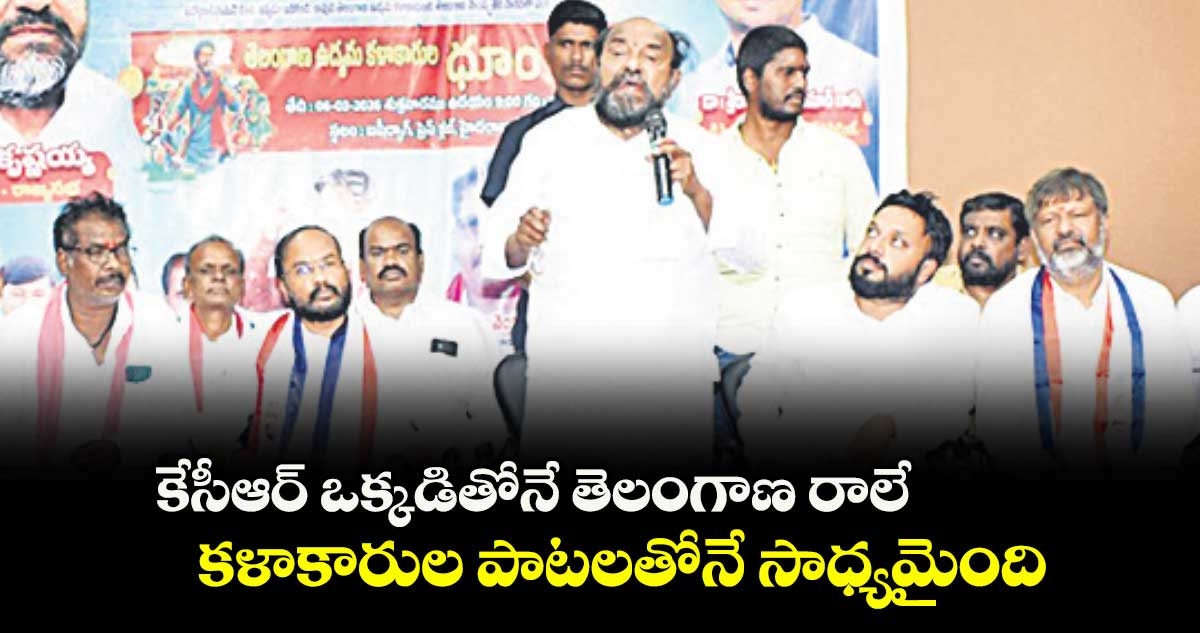 బషీర్బాగ్, వెలుగు : ‘తెలంగాణ రాష్ట్రం కేసీఆర్ ఒక్కడి వల్లే రాలేదు, కళాకారుల పాటలతోనే రాష్ట్ర ఏర్పాటు సాధ్యమైంది, ఒక్క పాట వంద ఉపన్యాసాలతో సమానం’ అని ఎంపీ ఆర్.కృష్ణయ్య అన్నారు. బీసీ కళామండలి జాతీయ అధ్యక్షుడు రామలింగం అధ్యక్షతన శుక్రవారం హైదరాబాద్లోని బషీర్బాగ్ ప్రెస్క్లబ్లో జరిగిన ధూంధాం కార్యక్రమంలో ఆయన మాట్లాడారు. తెలంగాణ ఉద్యమంలో కీలకపాత్ర పోషించిన కళాకారులను బీఆర్ఎస్ ప్రభుత్వం విస్మరించిందన్నారు. కళాకారులకు ఉద్యోగాలు ఇచ్చేందుకు సీఎం రేవంత్రెడ్డి చొరవ చూపాలని కోరారు. సమావేశంలో బీసీ సంక్షేమ సంఘం జాతీయ వర్కింగ్ ప్రెసిడెంట్ అరుణ్కుమార్, ఉపాధ్యక్షుడు గుజ్జ సత్యం, అనంతయ్య, రాజేందర్, కిరణ్కుమార్, ఎన్.వెంకటేశ్ పాల్గొన్నారు.