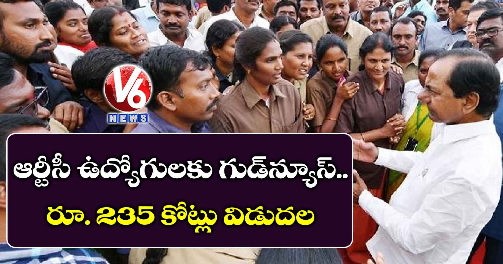 ఆర్టీసీ ఉద్యోగులకు తెలంగాణ ప్రభుత్వం శుభవార్త చెప్పింది. తమ డిమాండ్లు నెరవేర్చాలని కోరుతూ.. ఆర్టీసీ ఉద్యోగులు తెలంగాణలో 50 రోజులకు పైగా సమ్మె చేశారు. ఆ సమ్మె కాలానికి సంబంధించి.. ఉద్యోగులకు జీతాలు చెల్లిస్తామని సీఎం కేసీఆర్ ఆర్టీసీ ఉద్యోగులతో జరిపిన చర్చలలో తెలిపారు. ఆ మాట ప్రకారం ఆర్టీసీ ఉద్యోగుల సమ్మె కాలానికి సంబంధించిన జీతాలను ప్రభుత్వం విడుదల చేసింది. గతంలో ముఖ్యమంత్రి కె. చంద్రశేఖర్ రావు ఇచ్చిన హామీ మేరకు ఆర్టీసీ ఉద్యోగులు ఇటీవల చేసిన సమ్మె కాలానికి సంబంధించిన రూ.235 కోట్లను విడుదల చేస్తూ ఆర్థిక శాఖ ఉత్తర్వులు జారీ చేసింది.