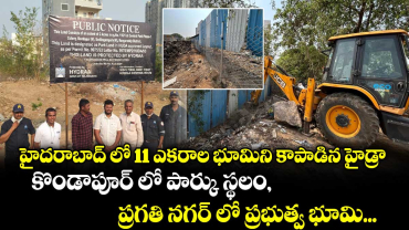 హైదరాబాద్ లో 11 ఎకరాల భూమిని కబ్జా చెర నుంచి కాపాడింది హైడ్రా. కొండాపూర్, ప్రగతి నగర్ లో పార్కు, డంప్ యార్డు, శ్మశానవాటిక భూముల్లో ఆక్రమణలు తొలగించింద