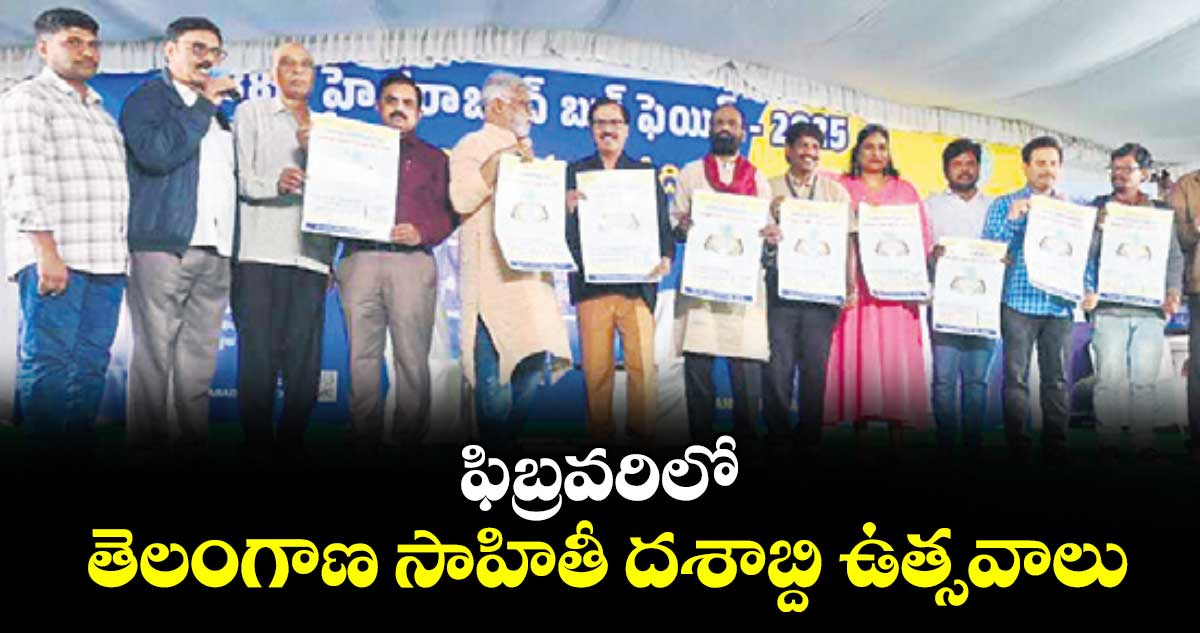 ముషీరాబాద్, వెలుగు: హైదరాబాద్లోని ఏవీ కాలేజీలో వచ్చే ఫిబ్రవరి 7, 8 తేదీల్లో తెలంగాణ సాహితీ దశాబ్ది ఉత్సవాలు నిర్వహించనున్నట్లు తెలంగాణ సాహితి రాష్ట్ర ప్రధాన కార్యదర్శి కె.ఆనందచారి తెలిపారు. శుక్రవారం బుక్ఫెయిర్లో సాహితీ లిటరరీ ఫెస్ట్ 2026 పోస్టర్ ను ప్రముఖ సినీ గేయ రచయిత సుద్దాల అశోక్ తేజ, ప్రకృతి కవి జయరాజ్ ఆవిష్కరించారు. కార్యక్రమంలో బుక్ ఫెయిర్ అధ్యక్షుడు కవి యాకూబ్, కార్యదర్శి ఆర్.వాసు, కేంద్ర సాహిత్య అకాడమీ యువ పురస్కార గ్రహీతలు మోర్సీమార్గరెట్, తగుళ్ల గోపాల్, తెలంగాణ సాహితి నాయకులు పాల్గొన్నారు. అనంతరం పుస్తక స్ఫూర్తి, పుస్తకం ఒక దారి దీపం చర్చా గోష్టి నిర్వహించారు.