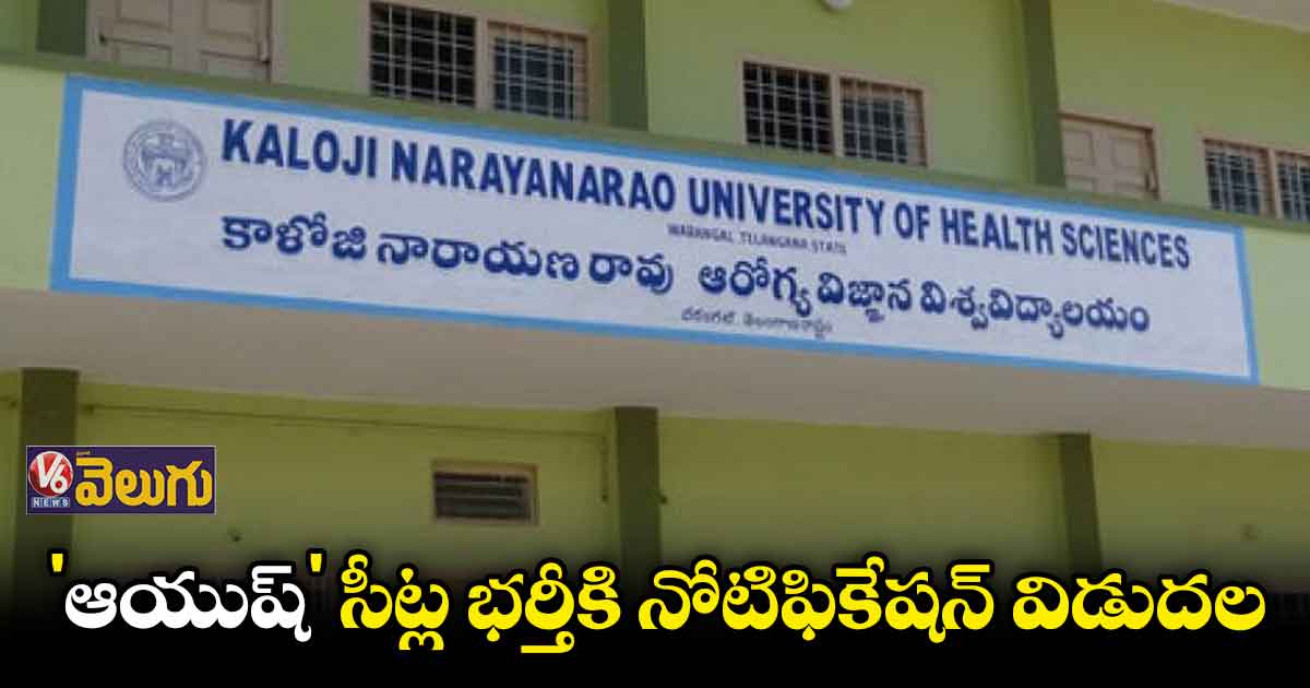 కాళోజీ హెల్త్ యూనివర్సిటీ, వరంగల్ : యూజీ ఆయుష్ వైద్య కోర్సులో ప్రవేశాలకు కాళోజీ ఆరోగ్య విశ్వవిద్యాలయం ప్రకటన జారీ చేసింది. ప్రభుత్వ, ప్రైవేట్ ఆయుష్ కళాశాలల్లో కన్వీనర్ కోటాలో బీఏఎంఎస్, బీహెచ్ఎంఎస్, బీయూఎంఎస్, బీఎన్ వైఎస్ కోర్సుల్లో ప్రవేశాలకు దరఖాస్తు కోరుతూ నేడు యూనివర్సిటీ నోటిఫికేషన్ జారీ చేసింది.