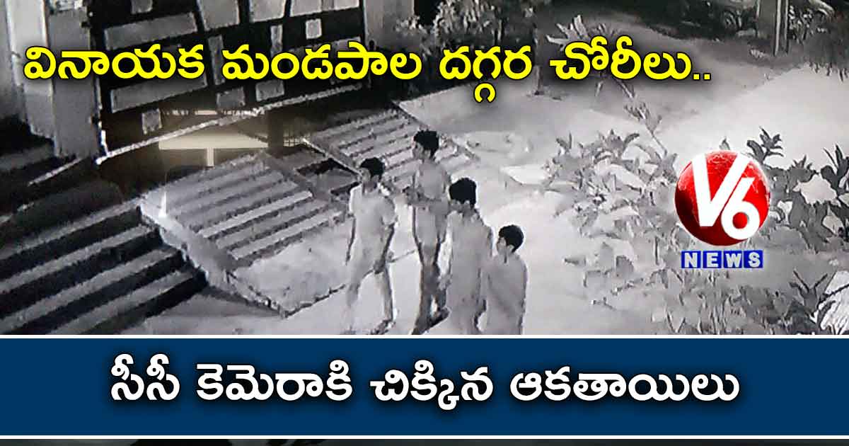 హైదరాబాద్ శివారు ప్రాంతాల్లో వినాయక మండపాల వద్ద ఆకతాయిలు రెచ్చిపోతున్నారు.. అర్ధరాత్రిళ్ళు నిర్మానుష్యంగా ఉన్న చిన్న చిన్న కాలనీలు, ఎవరూ నిద్రించని మంటపాల వద్ద దొంగతనాలకు తెగబడుతున్నారు.. ఎల్ బీ నగర్ పోలీస్ స్టేషన్ పరిధిలోని సాగర్ రింగ్ రోడ్డు మల్లికార్జునా నగర్, నాగార్జున నగర్ కాలనీలోని వినాయకుని మంటపం వద్ద రెండూ లడ్డూలతో పాటు హుండీని ఎత్తుకెళ్లారు. కాలనీలో ఏర్పాటు చేసిన సీసీ కెమరాల్లో లడ్డూలు దొంగలు చిక్కారు.. ముందుగా దర్జాగా మంటపం వద్దకు నడుచుకుంటూ వెళ్ళిన నలుగురు, లడ్డూలను, హుండీని దొంగిలించిన తరువాత సీసీ కెమరాలను చూశారు.. వెంటనే వాటిని తీసుకొని కాళ్ళకు పనిచెప్పారు.