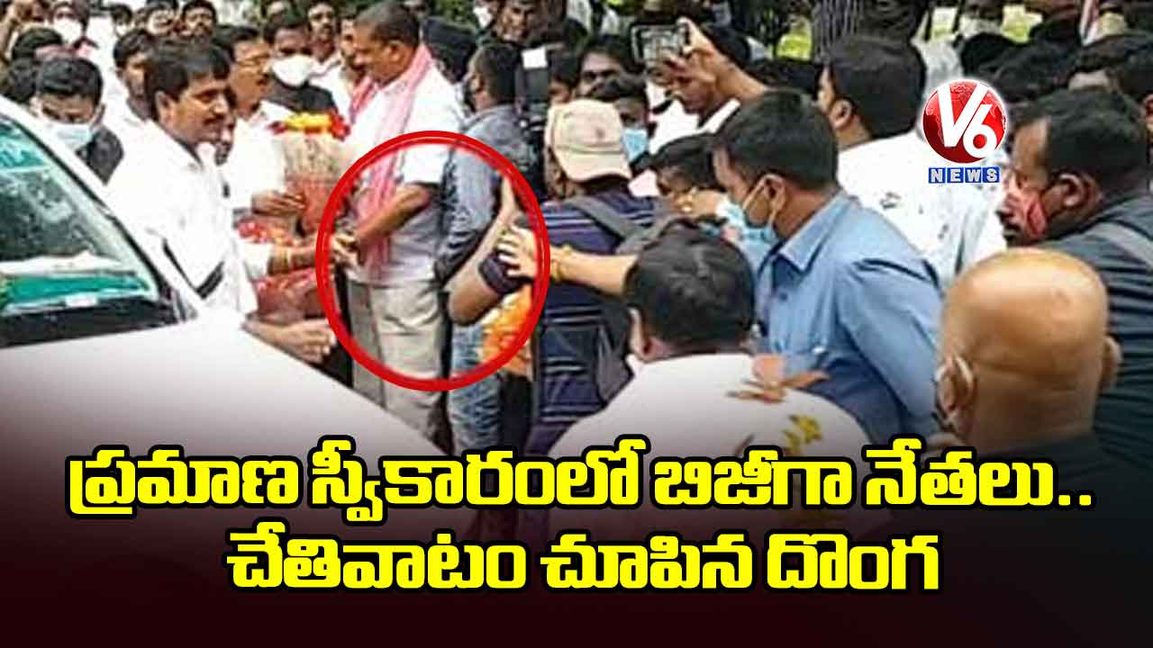 నల్గొండ మోత్కూర్ మార్కెట్ కమిటీ ప్రమాణస్వీకారం కార్యక్రమంలో చేతివాటం చూపించాడు ఓ దొంగ. సందట్లో సడేమియా అన్నట్లు.. స్థానిక నేతలు మంత్రుల స్వాగత బిజీలో ఉంటే.. దొంగ మాత్రం ఏం చక్కా జేబుల్లో చేతులు పెట్టి చోరీ చేశాడు. మార్కెట్ కమిటీ చైర్మన్ కొణతం యాకూబ్ రెడ్డి జోబులో నుంచి 40 వేలు.. మార్కెట్ కమిటీ వైస్ చైర్మన్ మూగల శ్రీనివాస్ జోబులో నుంచి 37 వేలు.. మోత్కూర్ ZPTC భర్త సంతోష్ రెడ్డి జోబులో నుంచి 40 వేలు దొంగిలించినట్లు చెప్పారు నేతలు. డబ్బులు చోరీ చేస్తున్న సీన్ వీడియో రికార్డు అయింది. ఘటనపై పోలీస్ స్టేషన్ లో ఫిర్యాదు చేస్తామంటున్నారు బాధిత నేతలు.
