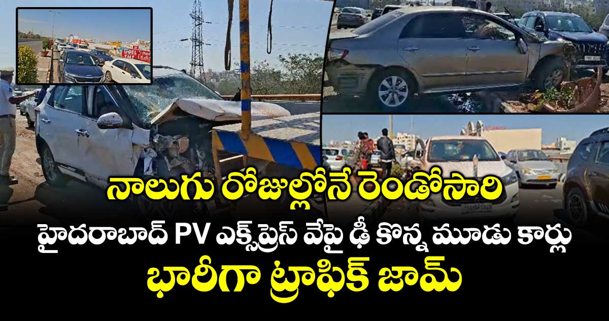 హైదరాబాద్ రాజేంద్రనగర్ పీవీఎన్ఆర్ ఎక్స్ ప్రెస్ వే పై రోడ్డు ప్రమాదం జరిగింది. డిసెంబర్ 20న పిల్లర్ నంబర్ 253 దగ్గర ఉదయం ఒకదానికొకటి మూడు కార్లు ఢీ కొన్నాయి. ఈ ఘటనలో మూడు కార్లు నుజ్జునుజ్జు అయ్యాయి. పూర్తిగా ధ్వంసం అయ్యాయి. కార్లలో ఉన్న పలువురికి తీవ్ర గాయాలయ్యాయి.
