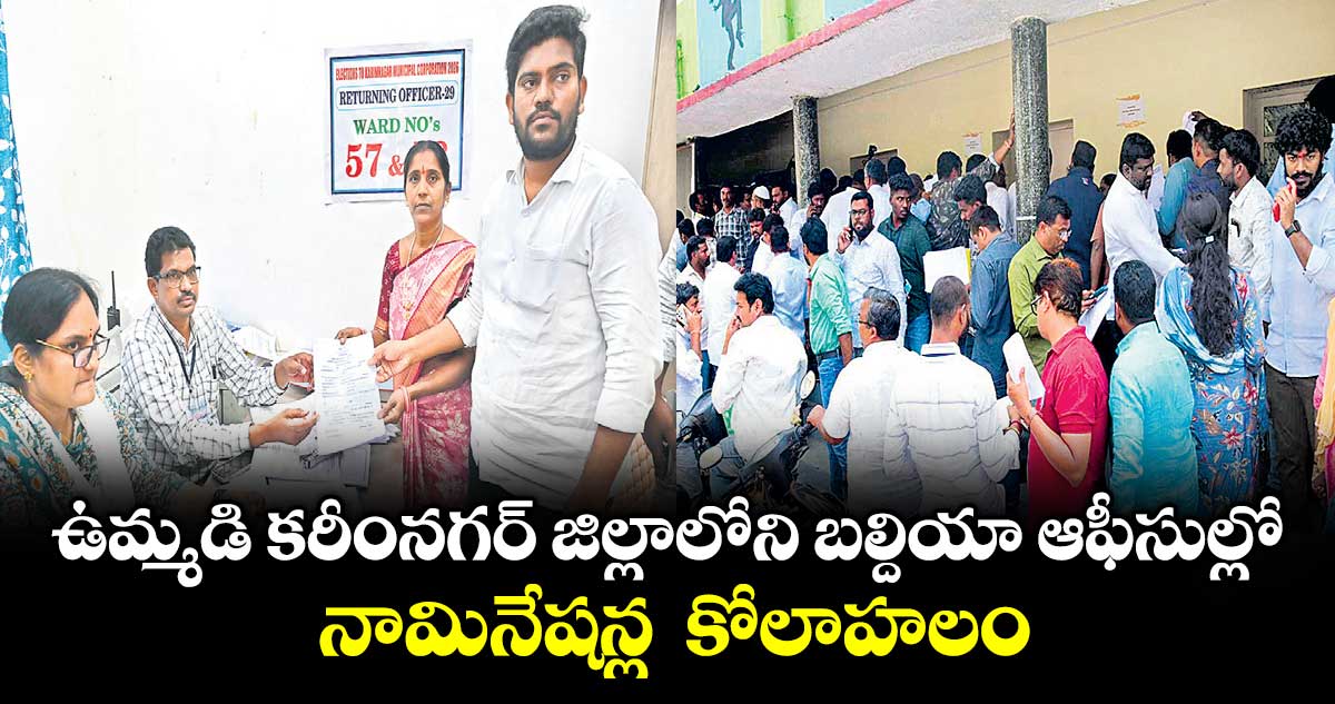 మరోవైపు కొందరు పార్టీ టికెట్ల కోసం తమ లీడర్ల ఇళ్ల దగ్గర క్యూ కట్టారు. జిల్లా కలెక్టర్ల పరిశీలన కరీంనగర్ జిల్లాలోని కరీంనగర్, జమ్మికుంట, హుజూరాబాద్ లోని నామినేషన్ల స్వీకరణ కేంద్రాలను కలెక్టర్ పమేలా సత్పతి పరిశీలించారు. ఎన్నికల సంఘం నిబంధనలు పాటిస్తూ నామినేషన్ల ప్రక్రియను పకడ్బందీగా చేపట్టాలని, ఎన్నికల విధుల పట్ల అప్రమత్తంగా వ్యవహరించాలని సిబ్బందిని ఆదేశించారు. చొప్పదండి మున్సిపాలిటీలో నామినేషన్లల స్వీకరణ ప్రక్రియను జిల్లా అడిషనల్ కలెక్టర్ అశ్విని తానాజీ వాకడే పరిశీలించారు.