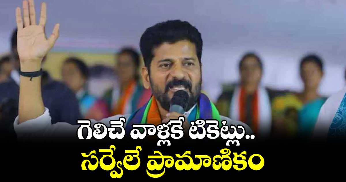 కాంగ్రెస్ పార్టీలో సర్వే అధారంగానే టికెట్ కేటాయింపు జరుగుతుందని టీపీసీసీ చీఫ్ రేవంత్ రెడ్డి అన్నారు. తనతో పాటుగా పార్టీలో ప్రతి ఒక్కరికి సర్వేనే ప్రామాణికమని చెప్పారు. కర్ణాటక అసెంబ్లీ ఎన్నికల్లో కూడా సీఎం సిద్దారామయ్య అడిగిన టికెట్ కాకుండా సర్వే ఆధారంగానే టిక్కెట్ ఇచ్చారని రేవంత్ తెలిపారు. కొత్తగా పార్టీలో చేరే వారికి కూడా ఇదే వర్తిస్తుందని స్పష్టం చేశారు. రాష్ట్ర వ్యవహారాల ఇంఛార్జ్ ఠాక్రే కూడా ఇదే విషయాన్ని చెప్పారన్నారు
