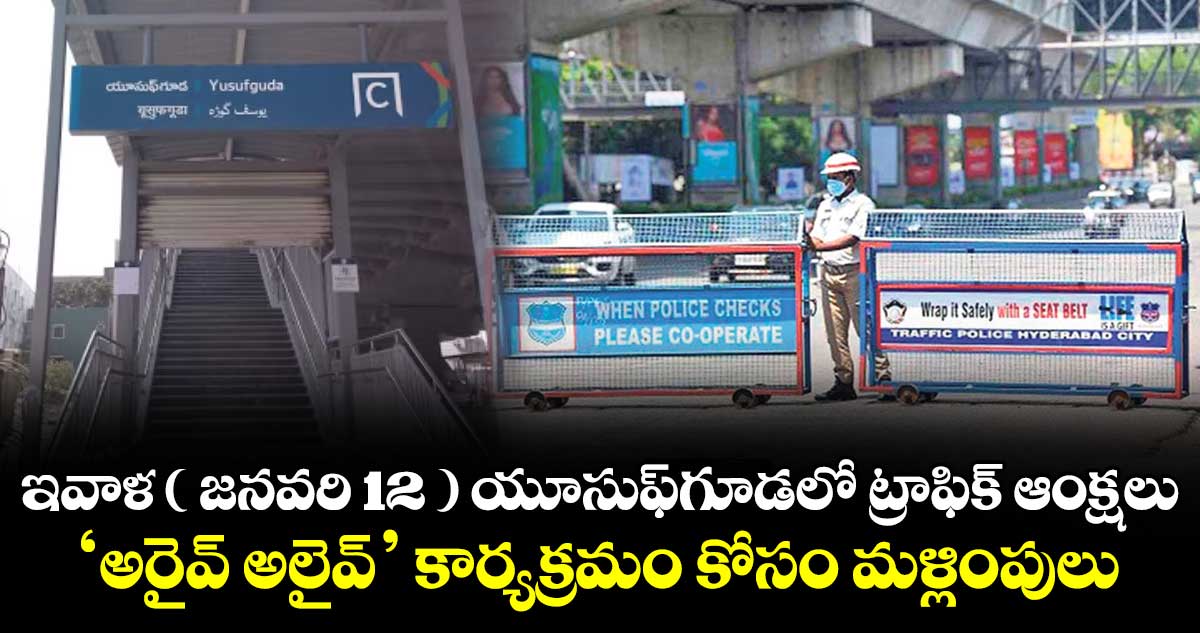 హైదరాబాద్ సిటీ, వెలుగు : కోట్ల విజయ భాస్కర్ రెడ్డి ఇండోర్ స్టేడియంలో తెలంగాణ పోలీసులు సోమవారం నిర్వహించే ‘అరైవ్ అలైవ్’ కార్యక్రమం సందర్భంగా యూసుఫ్గూడ ప్రాంతంలో ట్రాఫిక్ ఆంక్షలు ఉంటాయని సిటీ ట్రాఫిక్ జాయింట్ సీపీ జోయల్ డెవిస్ తెలిపారు. సోమవారం మధ్యాహ్నం 2.30 గంటల నుంచి సాయంత్రం 6 గంటల వరకు పలు చోట్ల డైవర్షన్లు అమలు చేస్తారు.