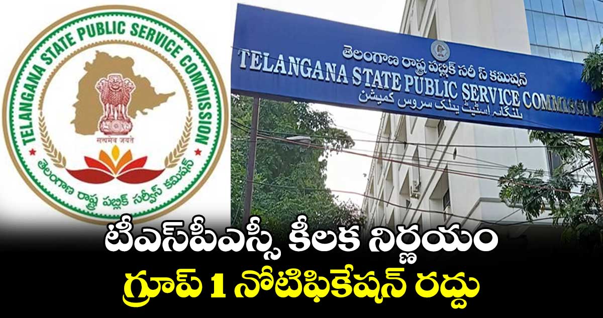 టీఎస్పీఎస్సీ కీలక నిర్ణయం తీసుకుంది. గత బీఆర్ఎస్ హయాంలో ఇచ్చిన గ్రూప్ 1 నోటిఫికేషన్ను రద్దు చేసింది. ఈ మేరకు 2024 ఫిబ్రవరి 19న వెబ్నోట్ను విడుదల చేసింది. 2022 ఏప్రిల్లో 503 పోస్టులతో గ్రూప్ 1 నోటిఫికేషన్ విడుదల కాగా 3,50,000 మంది దరఖాస్తు చేసుకున్నారు. 2,80,000 మంది ప్రిలిమ్స్ పరీక్షకు హాజరయ్యారు.
