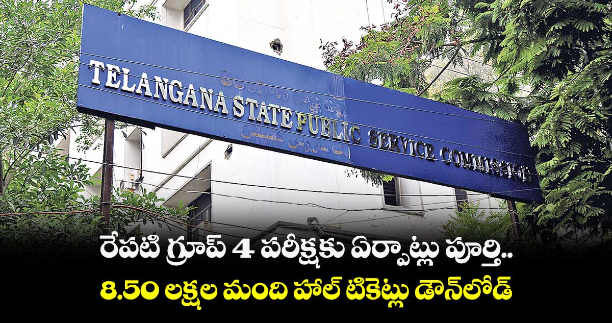 హైదరాబాద్, వెలుగు: రాష్ట్రంలో జులై1న జరిగే గ్రూప్ 4 పరీక్షకు టీఎస్పీఎస్సీ అధికారులు ఏర్పాట్లు పూర్తిచేశారు. శనివారం జరిగే ఈ పరీక్షకు 9,51,321 మంది అటెండ్ కానున్నారు. వీరికోసం 2,878 పరీక్షా కేంద్రాలను ఏర్పాటు చేశారు. గురువారం రాత్రి వరకూ 8.50లక్షల మంది హాల్ టికెట్లు వెబ్ సైట్ నుంచి డౌన్ లోడ్ చేసుకున్నారు. కాగా, శనివారం ఉదయం 10 గంటల నుంచి మధ్యాహ్నం12:30 గంటల వరకు పేపర్1 పరీక్ష జరగనుండగా, ఉదయం 8గంటల నుంచే పరీక్షా కేంద్రాల్లోకి అనుమతిస్తారు.