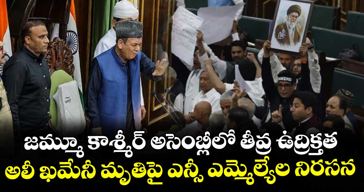 శ్రీనగర్: జమ్మూ కాశ్మీర్ శాసనసభలో ఊహించని పరిణామాలు చోటు చేసుకున్నాయి. ఇరాన్ అత్యున్నత నాయకుడు అయతొల్లా అలీ ఖమేనీ హత్యను నిరసిస్తూ శుక్రవారం నేషనల్ కాన్ఫరెన్స్ (NC) ఎమ్మెల్యేలు అసెంబ్లీలో ఆందోళనకు దిగడంతో తీవ్ర ఉద్రిక్తత నెలకొంది. బడ్జెట్ సమావేశాలు ప్రారంభమైన వెంటనే ఎన్సీ ఎమ్మెల్యేలు ఖమేనీ చిత్రపటాలను ప్రదర్శిస్తూ అమెరికా, ఇజ్రాయెల్ చర్యలకు వ్యతిరేకంగా నినాదాలు చేశారు. ఈ క్రమంలో కాంగ్రెస్ ఎమ్మెల్యే ఇర్ఫాన్ హఫీజ్ లోన్, బీజేపీ ఎమ్మెల్యే యుద్వీర్ సేథీ మధ్య తీవ్ర వాగ్వాదం జరిగింది.