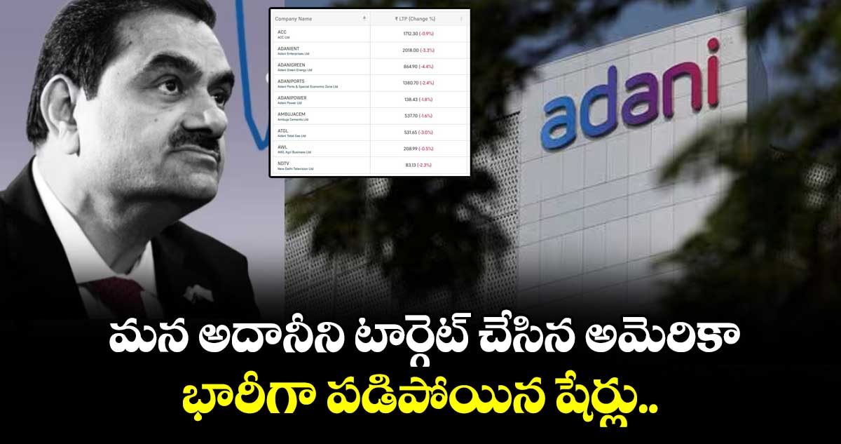 తాజా పరిణామాల మధ్య భారత స్టాక్ మార్కెట్లో లిస్టెడ్ అదానీ గ్రూప్ స్టాక్స్ ప్రతికూలంగా ప్రభావితం అవుతున్నాయి. అమెరికా అధికారులు అదానీని నేరుగా టార్గెట్ చేస్తున్నారనే వార్తలు బయటకు రావడంతో.. శుక్రవారం ఇంట్రాడే ట్రేడింగ్లో అదానీ గ్రూప్కు చెందిన లిస్టెడ్ స్టాక్స్ భారీగా కుప్పకూలాయి. ప్రధానంగా అదానీ ఎంటర్ప్రైజెస్, అదానీ పోర్ట్స్, అదానీ గ్రీన్ ఎనర్జీ షేర్లు దాదాపు 3% నుంచి 6% వరకు నష్టపోయాయి. ఇన్వెస్టర్లు ఆందోళనతో భారీగా అమ్మకాలకు పాల్పడటంతో అదానీ గ్రూప్ మార్కెట్ విలువ లక్షల కోట్ల మేర ఆవిరైంది. హిండెన్బర్గ్ నివేదిక తర్వాత మళ్లీ అదే స్థాయిలో అదానీ స్టాక్స్ ఒత్తిడికి గురవ్వడం ప్రస్తుతం దేశీయ ఇన్వెస్టర్లను కలవరపెడుతోంది.