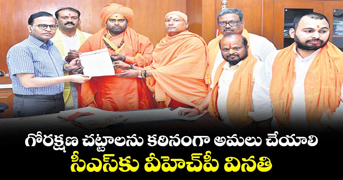 బషీర్బాగ్, వెలుగు: తెలంగాణలో గోరక్షణ చట్టాలను మరింత కఠినంగా, సమర్థవంతంగా అమలు చేయాలని కోరుతూ విశ్వహిందూ పరిషత్ (వీహెచ్పీ) ప్రతినిధి బృందం సోమవారం సచివాలయంలో రాష్ట్ర చీఫ్ సెక్రటరీ రామకృష్ణారావును కలిసి వినతిపత్రం సమర్పించింది. ఈ సందర్భంగా నాయకులు పగుడాకుల బాలస్వామి, రమేశ్ తదితరులు మాట్లాడుతూ.. రాష్ట్రంలో గోవుల అక్రమ రవాణా, వధ ఘటనలు పెరుగుతున్నాయని, వీటిని అరికట్టేందుకు ప్రత్యేక టాస్క్ ఫోర్స్ను నియమించాలని డిమాండ్ చేశారు.