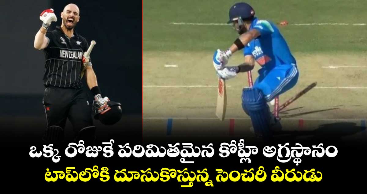 టీమిండియా స్టార్ బ్యాటర్, రన్ మెషీన్ విరాట్ కోహ్లీ ఐసీసీ వన్డే ర్యాంకింగ్స్ లో తన అగ్రస్థానాన్ని కోల్పోనున్నాడు. అదేంటో ఒక్క రోజులో నెంబర్ వన్ ర్యాంక్ పోవడం ఏంటి అనుకున్నా అదే నిజం. ఐసీసీ బుధవారం (జనవరి 14) ప్రకటించిన లేటెస్ట్ ర్యాంకింగ్స్ లో కోహ్లీ సహచరుడు రోహిత్ శర్మను వెనక్కి నెట్టి నెంబర్ వన్ స్థానంలో నిలిచాడు. అయితే రెండో స్థానంలో ఉన్న న్యూజిలాండ్ బ్యాటర్ డారిల్ మిచెల్ కోహ్లీ కంటే కేవలం ఒక్క రేటింగ్ పాయింట్ మాత్రమే వెనకపడి ఉన్నాడు. వన్డే ర్యాంకింగ్స్ లో కోహ్లీ 785 రేటింగ్ పాయింట్స్ తో కోహ్లీ టాప్ లో ఉండగా.. న్యూజిలాండ్ బ్యాటర్ డారిల్ మిచెల్ 784 పాయింట్లతో రెండో స్థానంలో నిలిచాడు.