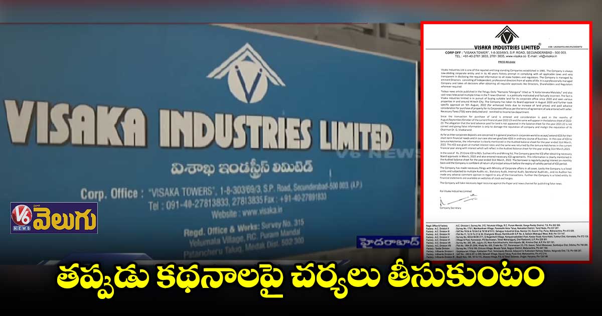 విశాక ఇండస్ట్రీస్ లిమిలెడ్ లావాదేవీలపై తప్పుడు ప్రచారాన్ని కంపెనీ యాజమాన్యం ఖండించింది . టీఆర్ఎస్ కు చెందిన టీవీ, పేపర్ లో రాజకీయ దురుద్దేశంతో కథనాలు రాశారని విశాక మేనేజ్ మెంట్ తెలిపింది. కంపెనీ చైర్మన్ వివేకానంద్ ప్రతిష్టను దెబ్బతీసేలా తప్పుడు ప్రచారం చేశారని యాజమాన్యం చెప్పింది. కంపెనీ కార్పొరేట్ ఆఫీస్ కోసం భూమిని 2020 నుంచే చూస్తున్నామని.. 2020 ఆగస్టులో బోర్డు అనుమతితో జాగా ఫైనల్ చేసి అడ్వాన్స్ కూడా ఇచ్చామని యాజమాన్యం తెలిపింది. దీనికి సంబంధించిన టీడీఎస్ కూడా ఐటీకి చెల్లించామని క్లారిటీ ఇచ్చింది. ఈ ఏడాది లావాదేవీలు జరిగాయి కాబట్టి.. వచ్చే ఏడాదిలో వివరాలుంటాయని స్పష్టం చేసింది.