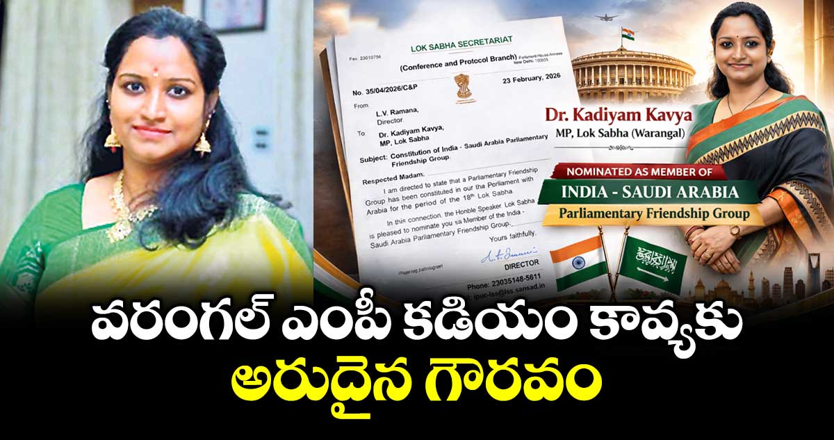 న్యూఢిల్లీ, వెలుగు: వరంగల్ ఎంపీ కడియం కావ్యకు అరుదైన గౌరవం లభించింది. ఇండియా–సౌదీ అరేబియా పార్లమెంటరీ ఫ్రెండ్షిప్ గ్రూప్ సభ్యురాలిగా ఆమెను లోక్సభ స్పీకర్ నామినేట్ చేశారు. ఈ మేరకు లోక్సభ సెక్రటేరియట్ (కాన్ఫరెన్స్ అండ్ ప్రోటోకాల్ బ్రాంచ్) అధికారిక ఉత్తర్వులు జారీ చేసింది.