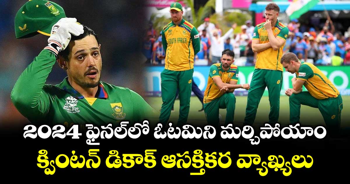 2024 ఫైనల్ ఎందుకు అంతగా బాధను మిగిల్చిందో అర్థం చేసుకోవడం కష్టం కాదు.. బార్బడోస్లో జరిగిన ఆ మ్యాచ్లో దక్షిణాఫ్రికా తొలి టీ20 వరల్డ్ కప్ కప్పు అంచు వరకూ చేరింది అని క్వింటన్ డికాక్ తెలిపాడు. చివరి 30 బంతుల్లో 30 పరుగులు మాత్రమే కావాల్సిన స్థితిలో, హైన్రిచ్ క్లాసెన్ విధ్వంసకరంగా ఆడుతూ అక్షర్ పటేల్ బౌలింగ్ లో 24 పరుగులు కొట్టాడు. కప్పు దక్షిణాఫ్రికా చేతుల్లోకి వెళ్లబోతుందనిపించిన క్షణంలో.. 17వ ఓవర్ వేసిన హార్దిక్ పాండ్యా క్లాసెన్ను అవుట్ చేయడంతో మ్యాచ్ పూర్తిగా తలకిందులైంది. 177 పరుగుల లక్ష్య ఛేదనలో చివరి మూడు ఓవర్లలో తమ జట్టు తడబడటంతో.. స్వల్ప పరుగుల తేడాతో ఓడిపోయినట్లు వెల్లడించాడు.