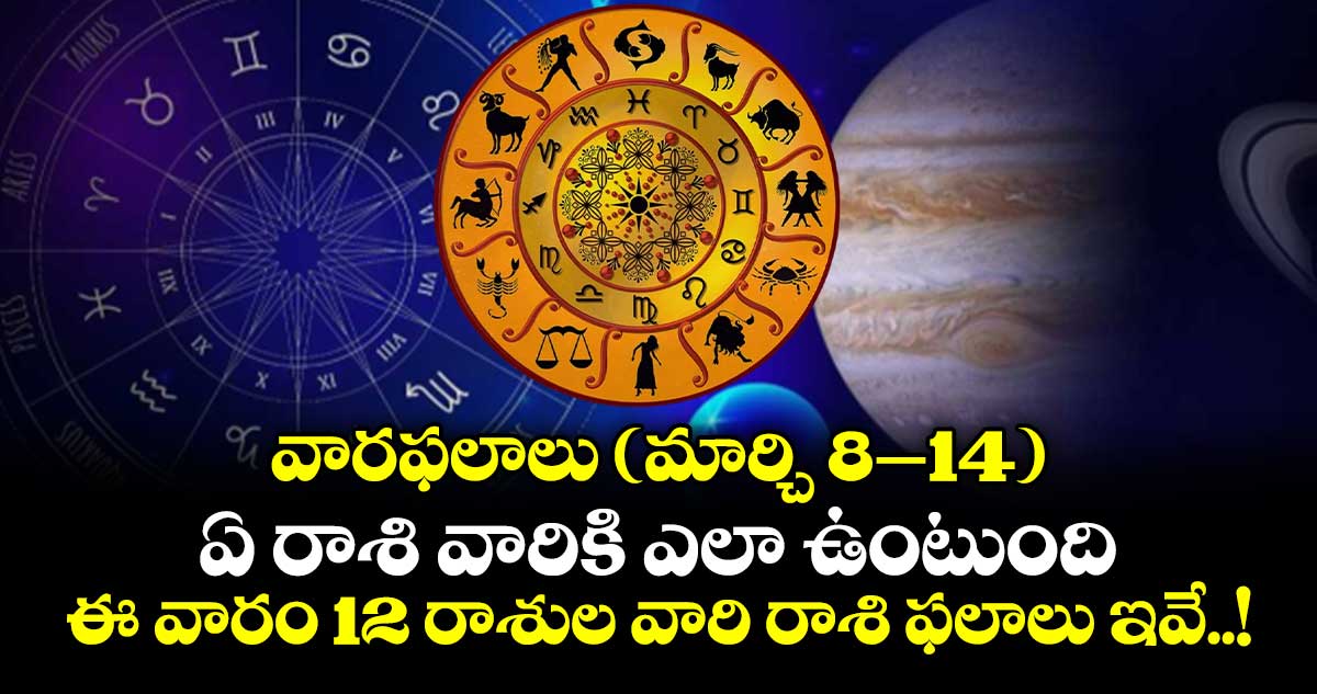 వారఫలాలు ( మార్చి 8–14 ): జ్యోతిష్య నిపుణులు తెలిపిన వివరాల ప్రకారం.. ఈ వారంలో కొన్ని రాశుల వారికి కలిసొస్తుంది. మరికొందరికి ఇబ్బందులు తలెత్తుతాయి. మరి 2026 సంవత్సరంలో మార్చి 08 నుంచి మార్చి 14 వరకు ఏ రాశి వారికి ఎలా ఉందో తెలుసుకుందాం. . !
