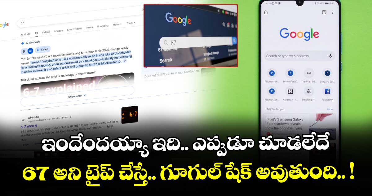 పొద్దున లేచినప్పటి నుంచి ఫోన్ పట్టుకోవటం కామన్.. ఫోన్ పట్టుకున్నప్పటి నుంచి గూగుల్ సెర్చ్ చేసి చూడటం వెరీ వెరీ కామన్. మనకు కావాల్సినవి ఏవో సెర్చ్ చేసుకుని వెళ్లిపోతాం.. నెంబర్ అంటూ ఎప్పుడూ టైప్ చేయం.. అంత అవసరం పెద్దగా ఎవరికీ రాదు.. గూగుల్ సెర్చ్ లో 67 అని టైట్ చేస్తే.. గూగుల్ షేక్ అవుతుంది.. అవును.. నిజం.. మీరూ ఓసారి ట్రై చేసి చూడండీ.. ఎందుకిలా జరుగుతుంది.. 67 నెంబర్ టైప్ చేసి సెర్చ్ చేయటానికి గూగుల్ పేజీ ఎందుకు షేక్ అవుతుందో తెలుసుకుందామా..