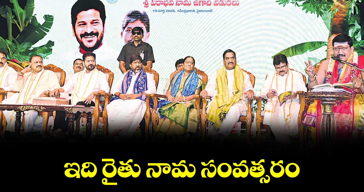 హైదరాబాద్, వెలుగు: ఇది రైతు నామ సంవత్సరమని, రాష్ట్రంలో వ్యవసాయాన్ని లాభసాటిగా మార్చి రైతును రాజును చేయడమే లక్ష్యంగా ముందుకెళ్తున్నామని సీఎం రేవంత్ రెడ్డి పేర్కొన్నారు. గురువారం రవీంద్రభారతిలో తెలంగాణ భాషా సాంస్కృతి, దేవాదాయ ధర్మాదాయ శాఖ ఆధ్వర్యంలో నిర్వహించిన శ్రీ పరాభవ నామ ఉగాది వేడుకల్లో డిప్యూటీ సీఎం మల్లు భట్టి విక్రమార్క, మంత్రులు జూపల్లి కృష్ణారావు, కొండా సురేఖ, పొంగులేటి శ్రీనివాస రెడ్డితో కలిసి సీఎం పాల్గొన్నారు. ఈ సందర్భంగా శ్రీ పరాభవ నామ ఉగాది పంచాంగాన్ని ఆవిష్కరించారు.