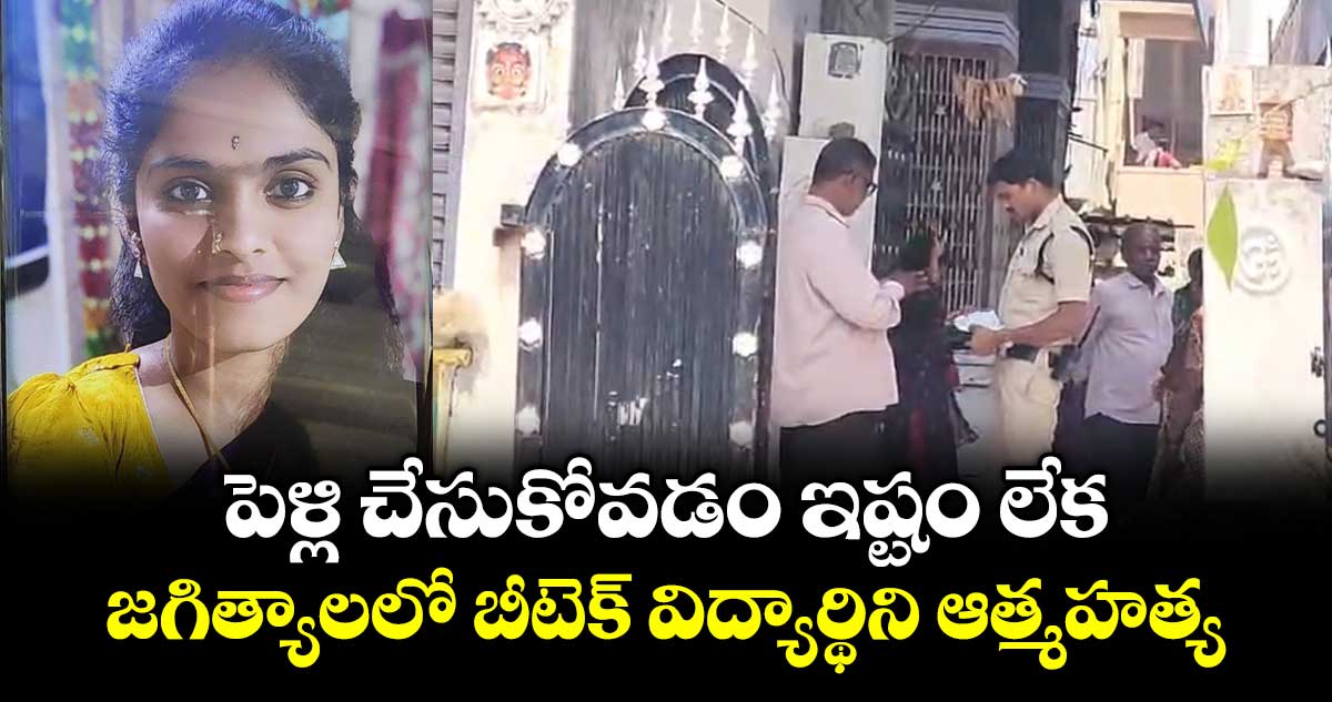 జగిత్యాల జిల్లాలో పెళ్లి చేసుకోవడం ఇష్టం లేక యువతి ఆత్మహత్య చేసుకుంది. పట్టణంలోని పోచమ్మవాడకు చెందిన ములస్థం ప్రణవి (25) ఇంట్లో ఉరి వేసుకొని ఆత్మహత్యకు పాల్పడింది. బీటెక్ పూర్తి చేసి ఇంటి వద్దే ఉంటున్న ప్రణవి విదేశాలకు వెళ్లాలని ఆసక్తి చూపగా.. తండ్రి పెళ్లి చేస్తానని చెప్పాడు.పెళ్లి చేసుకోవడం ఇష్టం లేక మనస్తాపానికి గురైన ప్రణవి ఇంట్లో ఎవరూ లేని సమయంలో సీలింగ్ ఫ్యాన్కు చీరతో ఉరివేసుకుని ఆత్మహత్యకు పాల్పడింది.